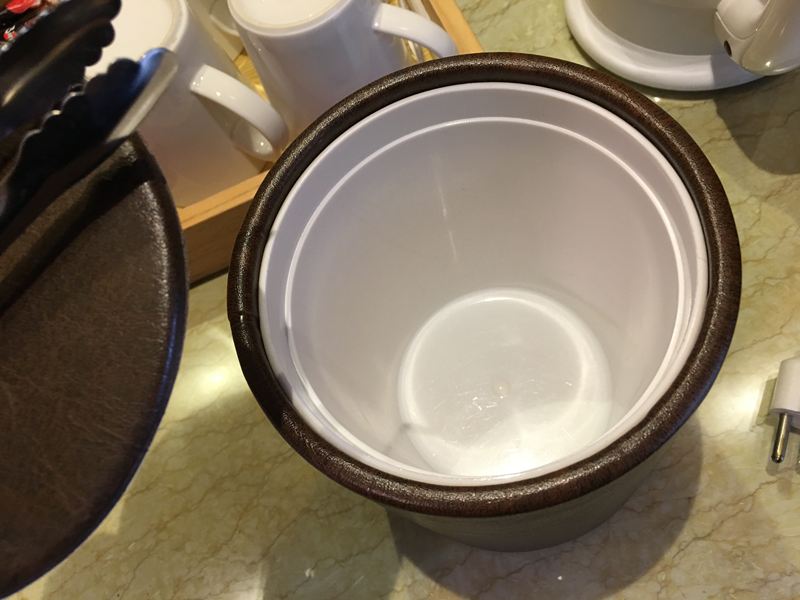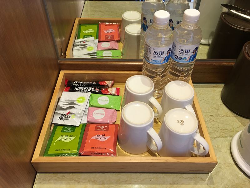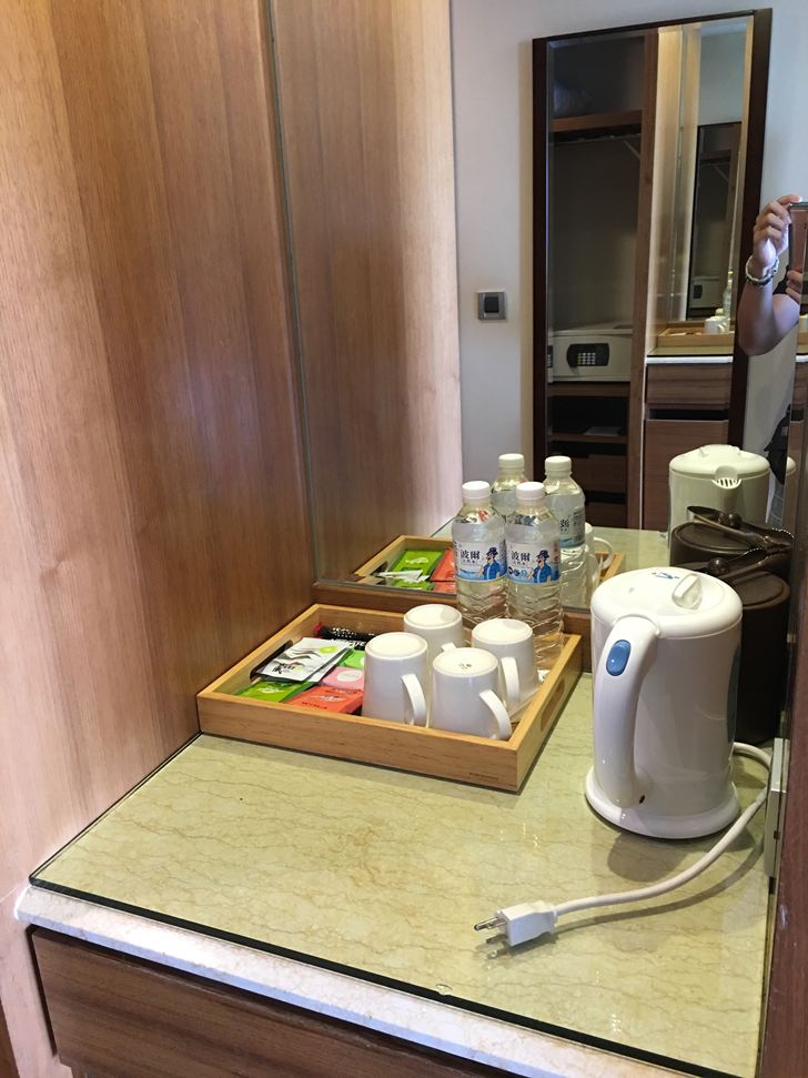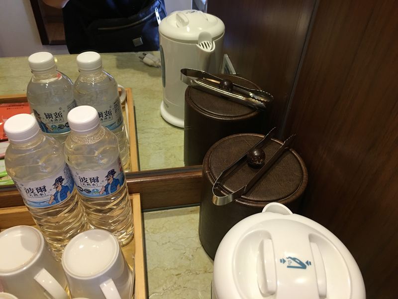飯店的基本配備,插電式熱水壺、茶包、冰桶
