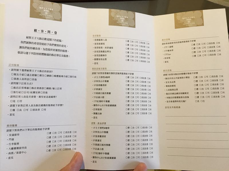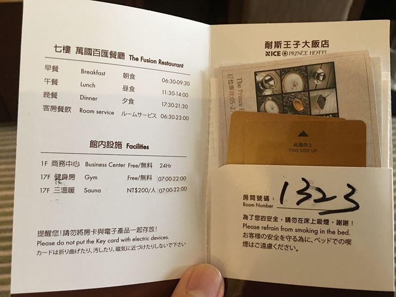 裡面寫著入住房號、早餐、午餐、晚餐時間,還有樓層設施
