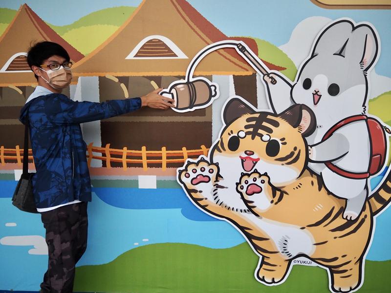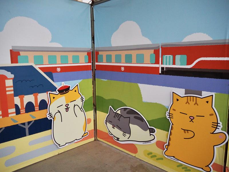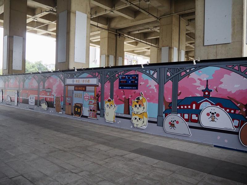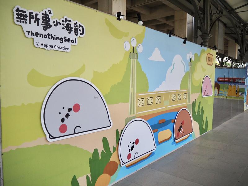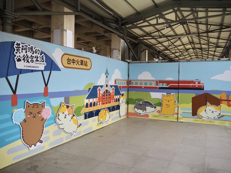 除了黃阿瑪領軍的牌樓以外,車站內還有互動拍照區:車站月台、柳川、後火車的帝國糖廠、台中公園等等,融入了台中各個知名景點等你來跟萌翻天的角色們合照