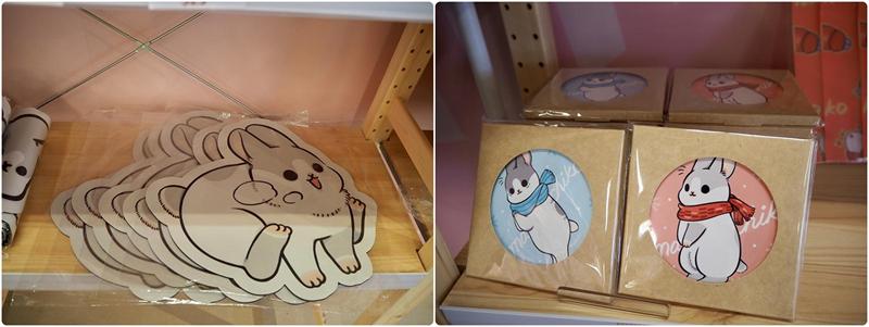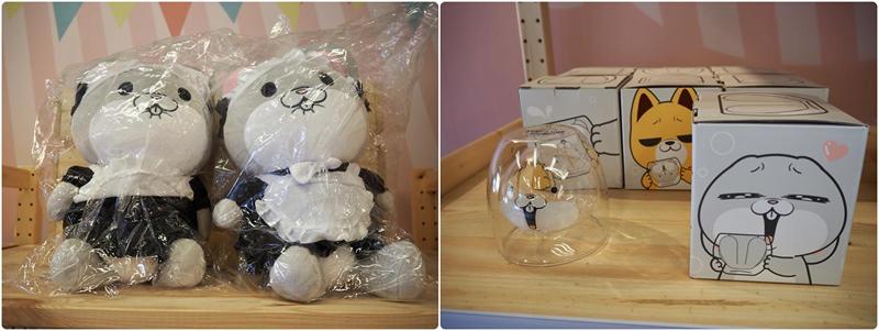 店內賣著許多原創角色的精品小物:娃娃、T恤、抱枕、磁鐵、口罩等等的商品,萌到讓人買種都想要帶回家收藏