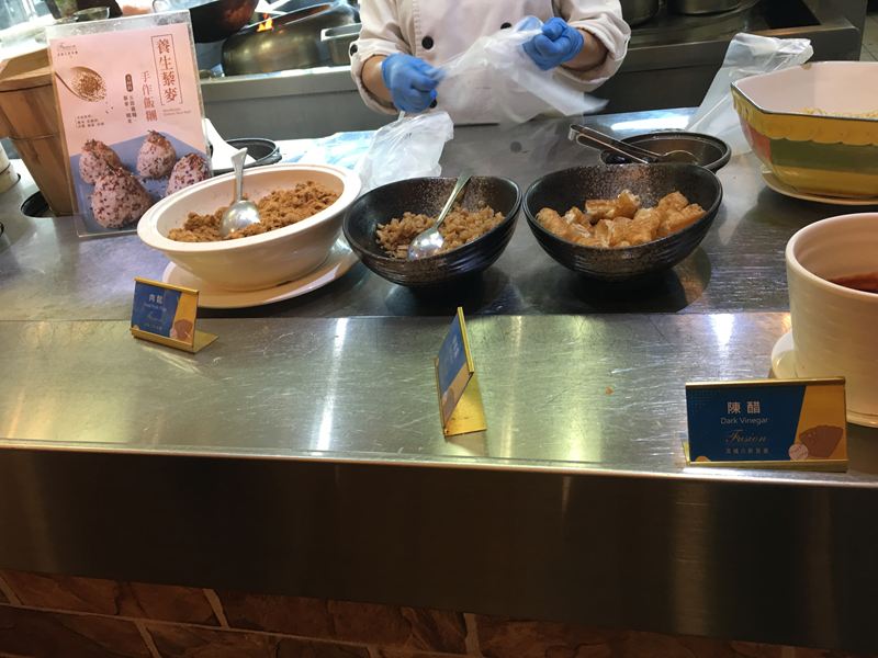 冷盤火腿、白粥、奶皇包、肉包、肉鬆、荷包蛋、麵筋