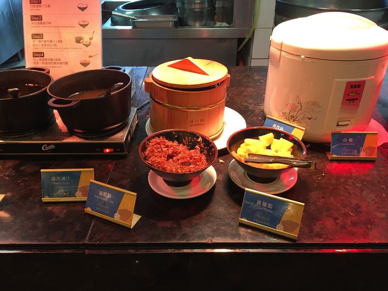 白飯、雞肉滷汁、油蔥酥、黃蘿蔔,香滷肉燥、香蔥油