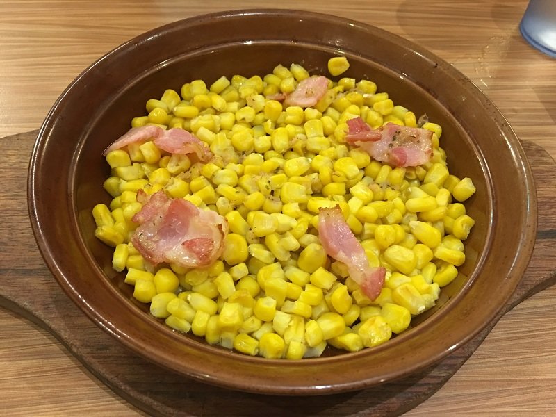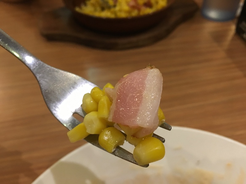 有著淡淡的蒜香味跟奶油味道,搭配著培根一起吃,鹹甜鹹甜得不錯吃