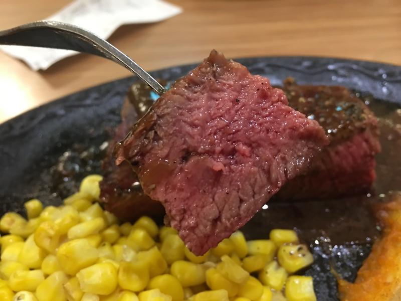 漂亮的粉色肉質,表皮吃起來有點微焦,中間肉質軟嫩不柴,牛排很好吃 XD
