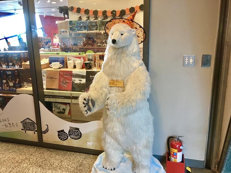 門口的北極熊在萬聖節這天也戴上了象徵萬聖節的帽子很吸睛 XD