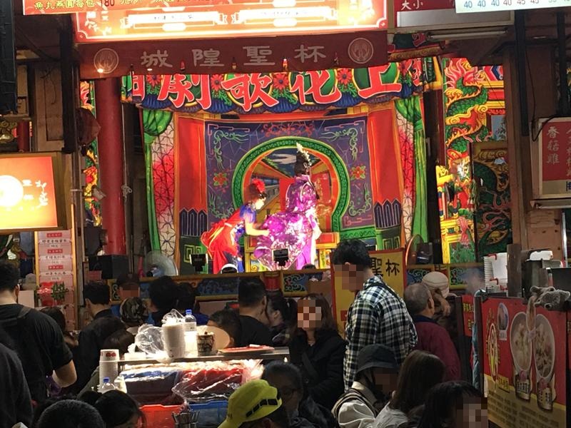 晚上攤位林立來這裡除了吃美食以外,城隍廟裡還有歌仔戲表演