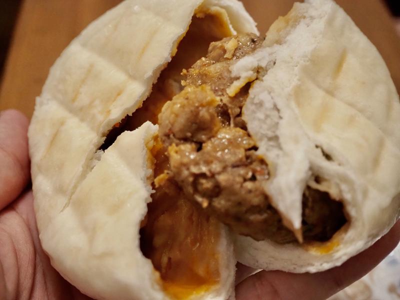 餡內肥瘦摻半、感覺梅干菜有炒過吃的到醬油的香氣,裡面一樣有肉汁滿好吃的