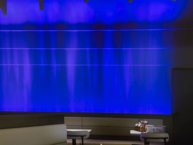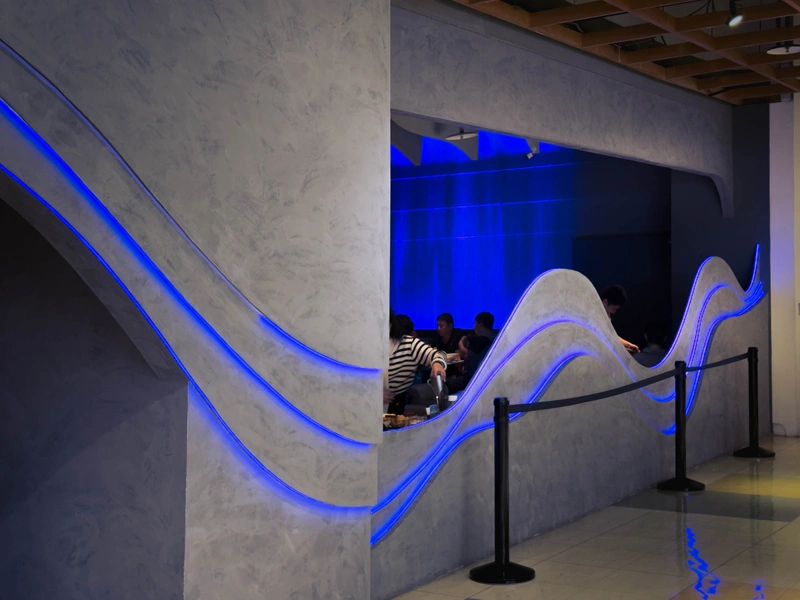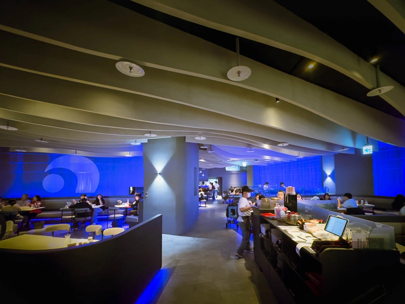 一走進店門,真的會忍不住發出「哇」的驚嘆聲!這裡以「深海」為主題,利用流動的線條、層層起伏的光影,以及靜謐的藍色調調,營造出一種彷彿置身於潛水站的感覺。室內設計融入了科技未來感,彎折的動線像是探索深海洞穴,完全顛覆了傳統美式早午餐的印象,絕對是拍照打卡的聖地!