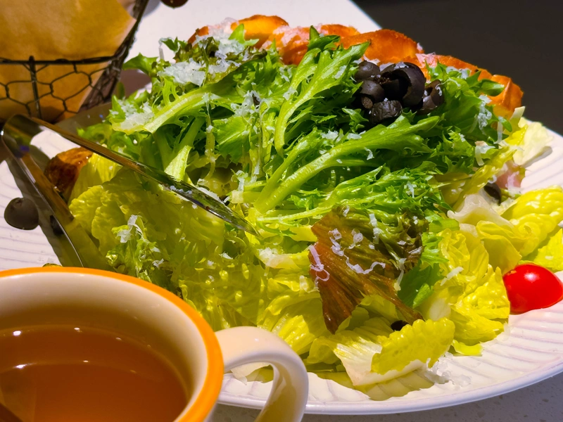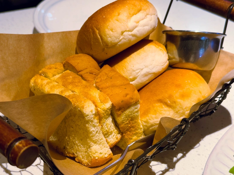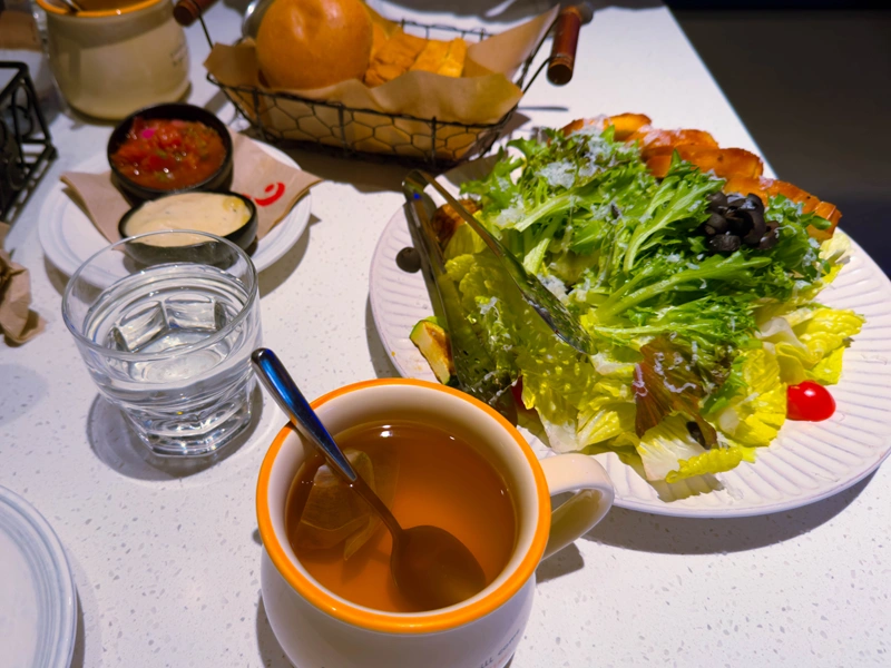 這道是肉食族的最愛!雞肉烤得外皮焦香、肉質多汁,刷上酸甜帶煙燻味的 BBQ 醬汁非常入味。最棒的是隨餐附上的歐式麵包盤,麵包口感紮實且越嚼越香,沾著雞汁或抹點奶油吃都超滿足。 - 兩杯無限續飲品