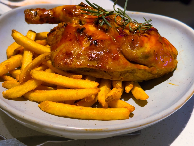 清爽的開胃首選!新鮮脆口的蘿蔓葉裹上濃郁的凱薩醬,撒上鹹香的起司粉與酥脆麵包丁,簡單卻經典,是開始大餐前的最佳平衡。 - BBQ 溫烤半雞(附歐式麵包盤)