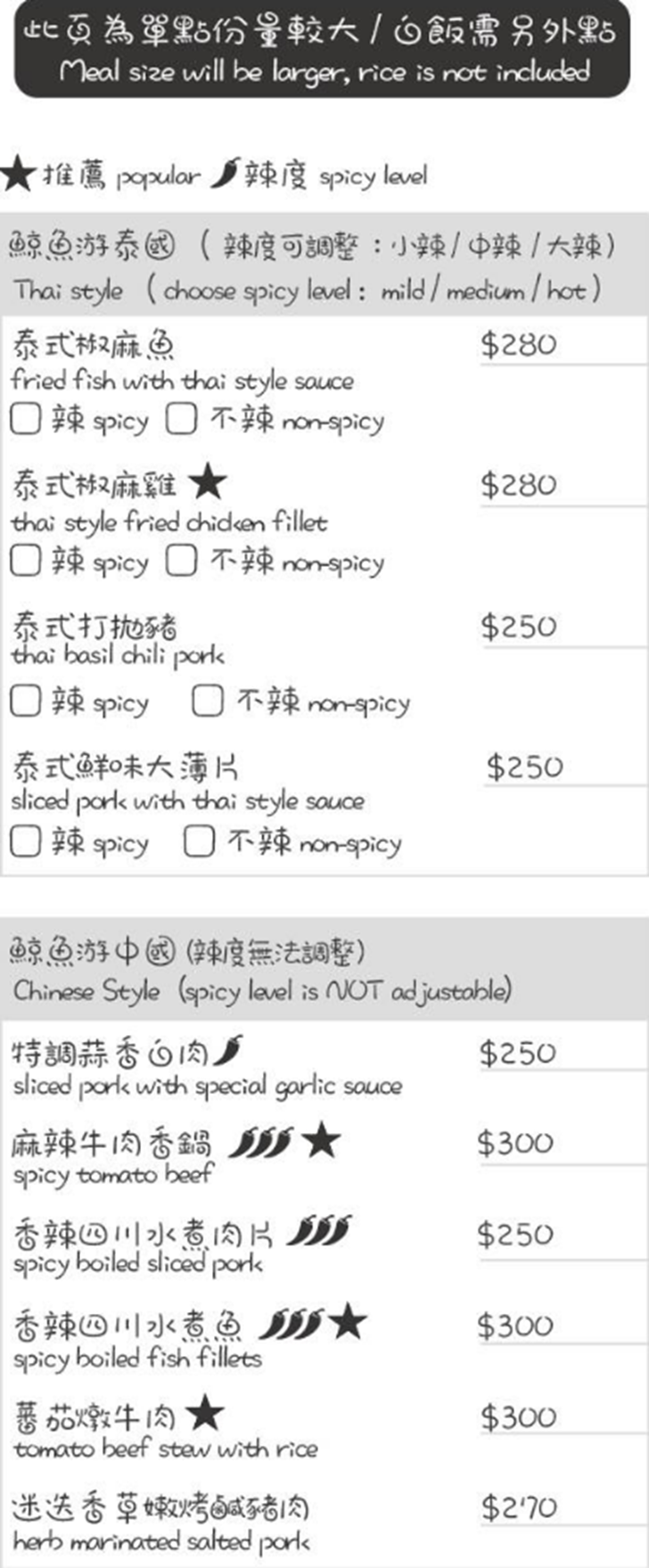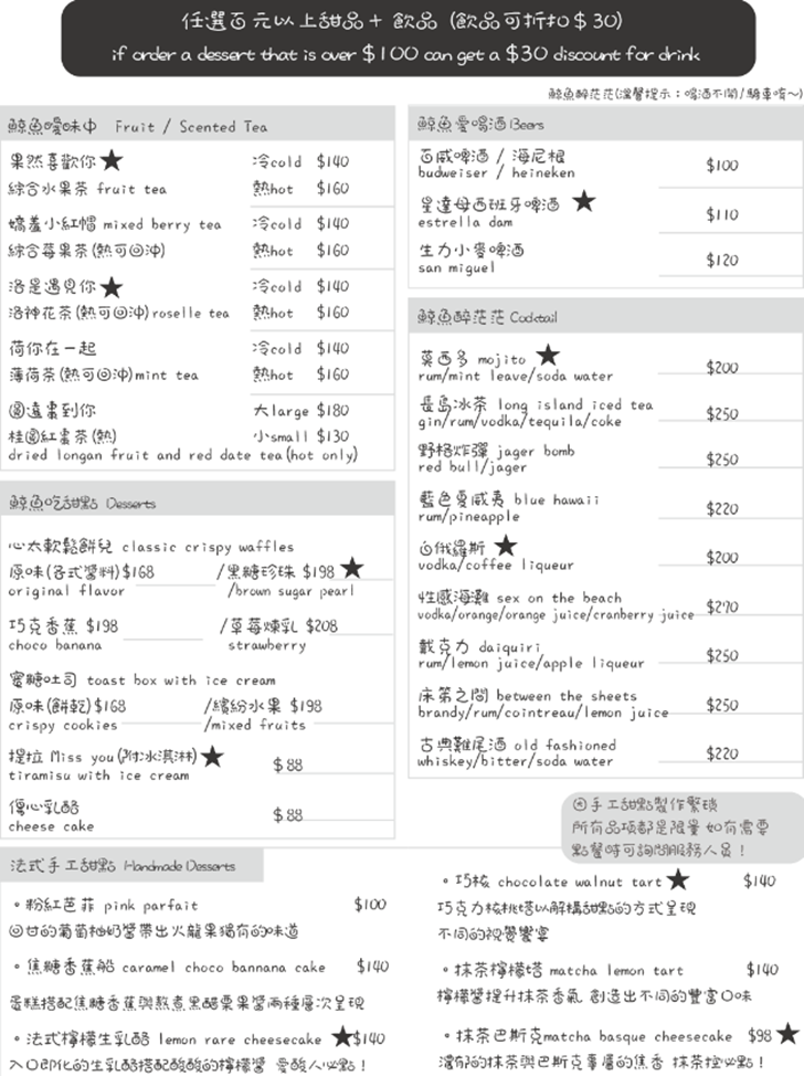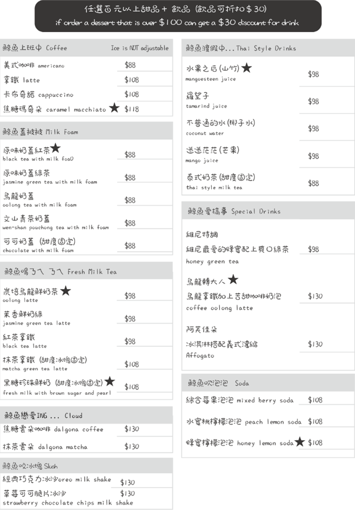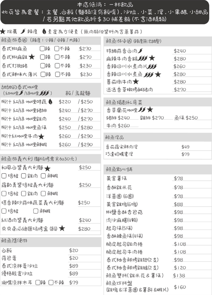 迷途鯨魚菜單種類有:主餐、單點、飲料、甜點等等的餐點,有最低消費(一杯飲料),套餐皆有附:白飯、沙拉、小菜、湯、果醋、小甜品,套餐的主菜也有提供單點,份量會比套餐還要多,可以加點白飯來配著吃,套餐沒有附飲料,消費只要點套餐 或 超過NT.100以上甜點再加點飲料都可以折抵NT.30