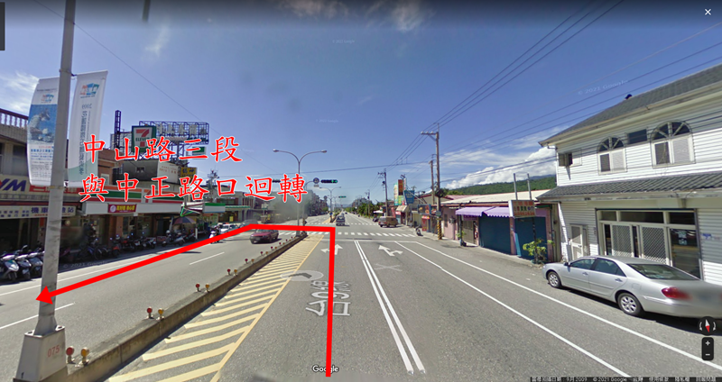 行經雪隧與蘇花改來到花蓮後,循台9線花東縱谷公路南下至中山路三段 與 中正路口迴轉