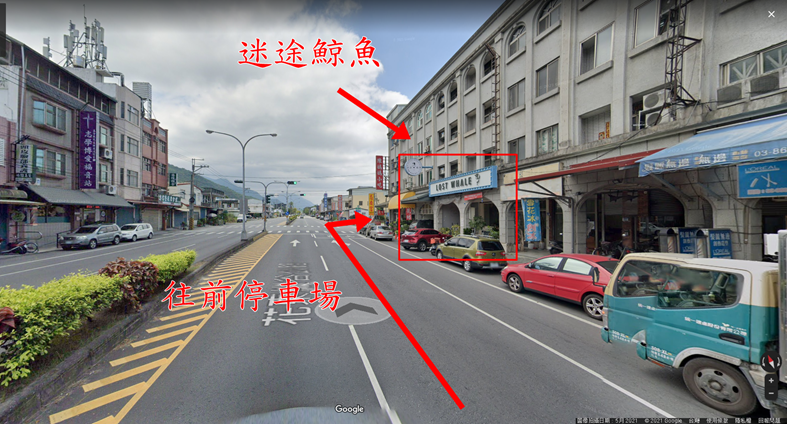 迴轉後往前開約100公尺就可看到迷途鯨魚在右手邊,繼續往前開到路口有一個空地可以停車