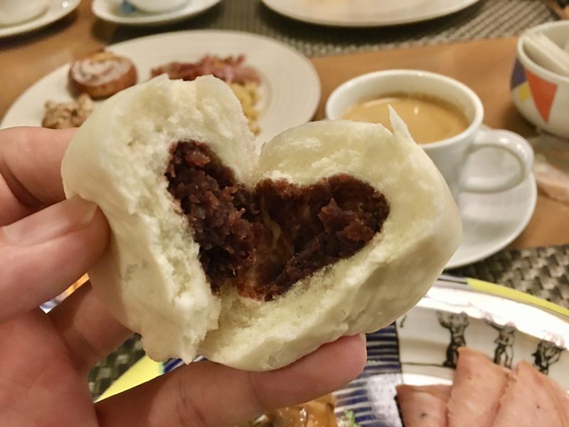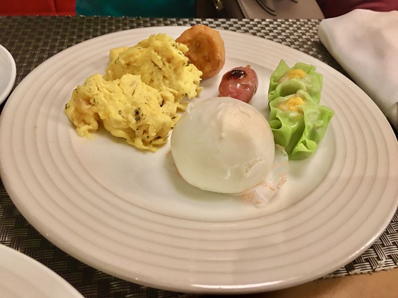 炒蛋、台式香腸、翡翠燒賣、豆沙包