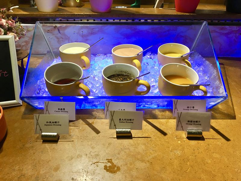 沙拉調味料:凱薩醬、千島醬、橙汁醬、和風油醋、義大利油醋、柳橙油醋六種可以供選擇