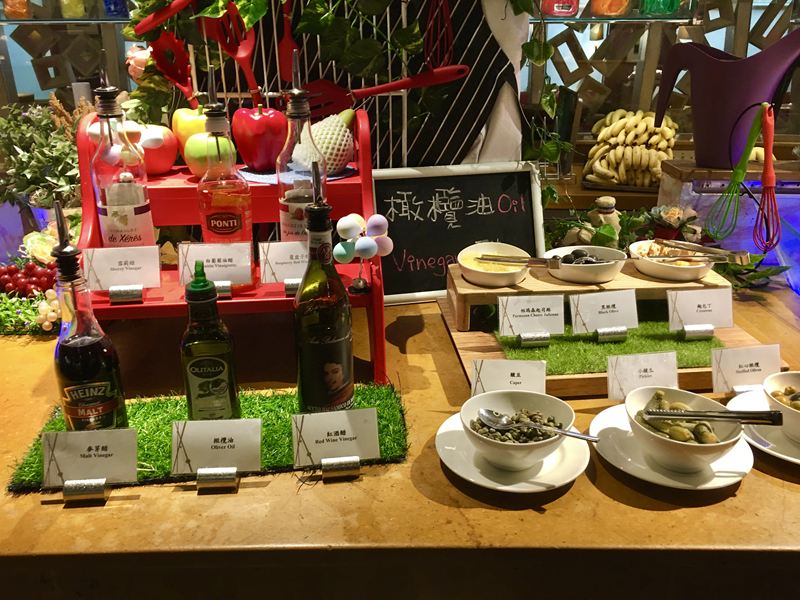 各式樣的醋料與橄欖油、起司、麵包丁等等可供調味使用