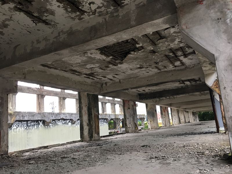 風吹雨打之下鋼筋裸露,水泥橫梁整個吊在半空中,