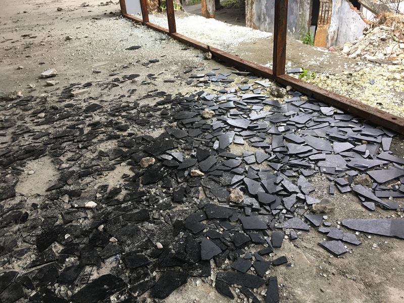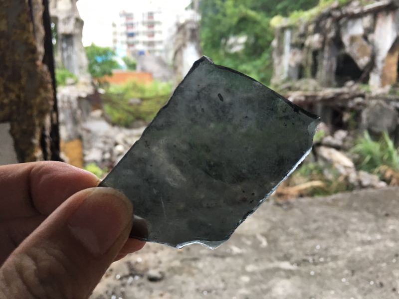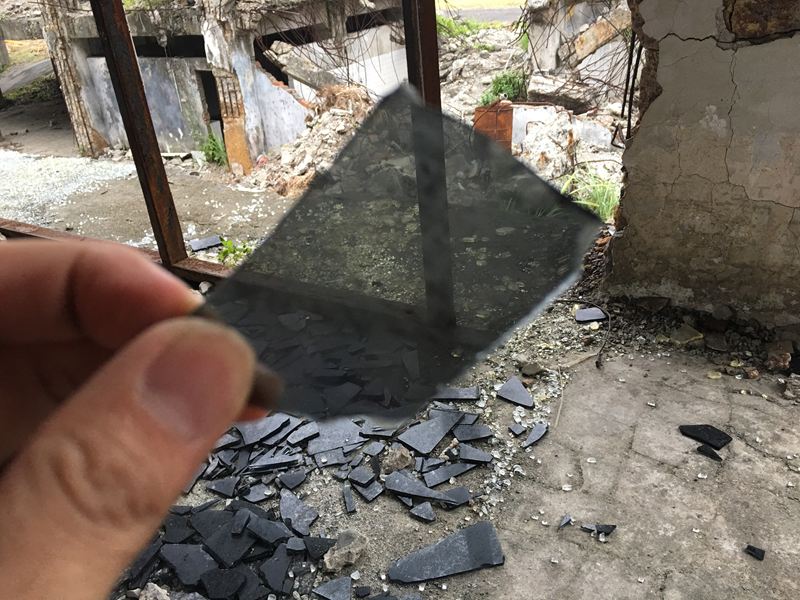碎裂的落地窗玻璃是,有點半透明的黑色玻璃