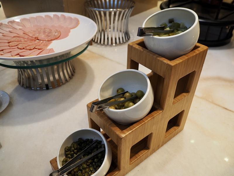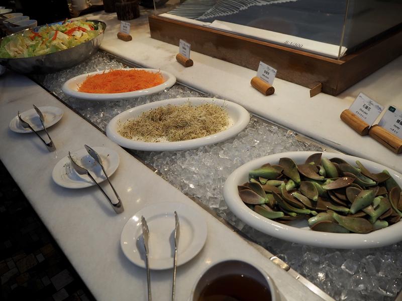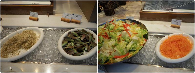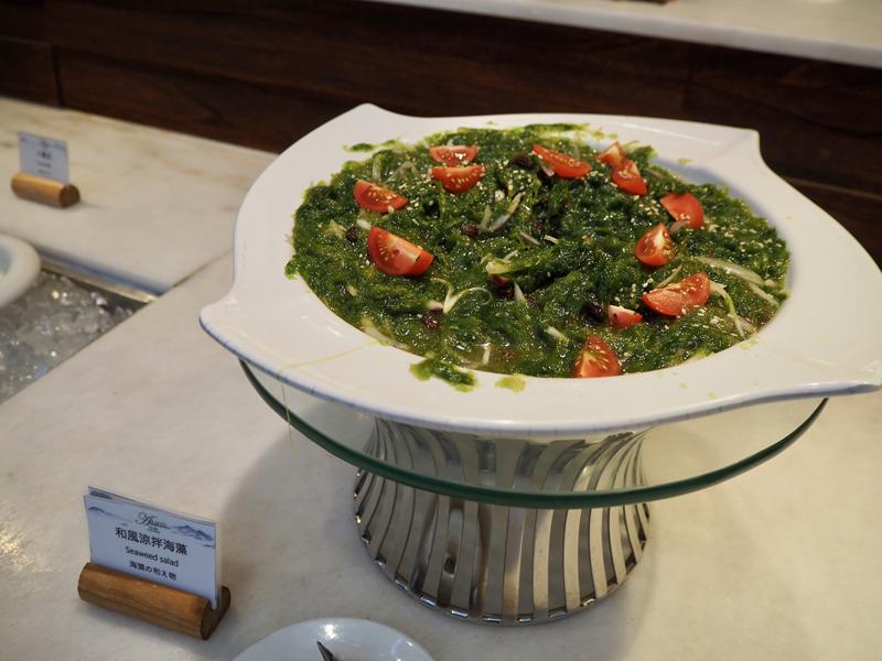 冷盤區有:綜合火腿、和風涼拌海藻、涼拌茶鵝、泰式涼拌海鮮、高山蘋果沙拉、起司番茄