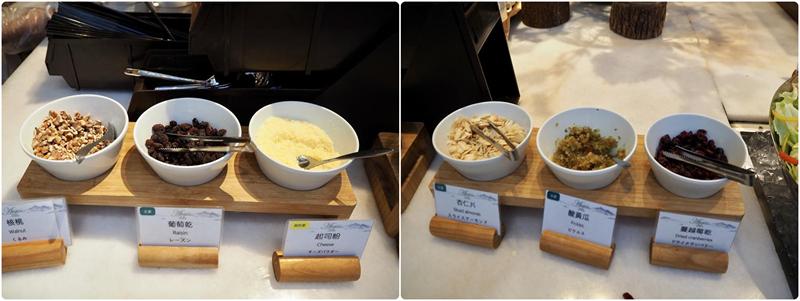↑ 各式堅果:核桃、葡萄乾、起司粉、杏仁片、酸黃瓜、蔓越莓乾