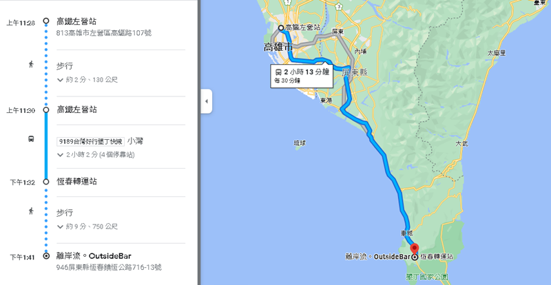 搭乘高鐵到高鐵左營站下車後轉搭 → (9189)台灣好行墾丁快線至恆春轉運站下車 → 在步行約9分鐘即可抵達離岸流酒吧