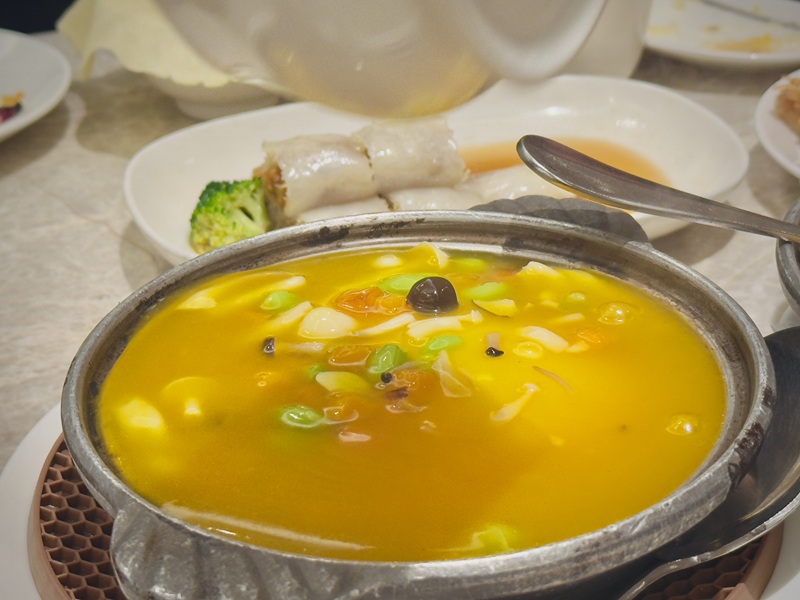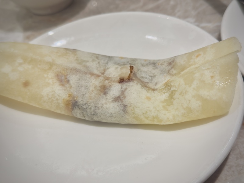 這道蟲草花腸粉嚐起來外軟內脆,裡面包裹著酥脆的拉花米網,搭配洋地瓜丁的微甜與杏鮑菇的香氣