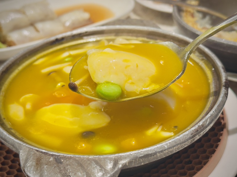 以傳統鐵砂鍋盛裝,散發著暖暖的豆香,搭配由新鮮南瓜泥與蔬菜丁熬製而成的濃郁醬汁,入口即化,細膩又滑口