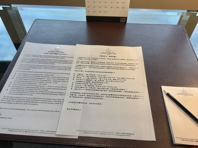 辦公桌上有一張飯店設施時間表與入注防疫注意事項