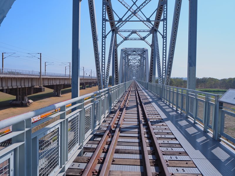 之前在IG上看到這座鐵橋上拍攝的照片,那種無限延伸的壓縮美感照後就一直想要來這裡看看,在這邊可以看到左右各有一座橋,左邊看起來比較舊的是真的有火車在走鐵軌,右邊看起來比較新的才是高屏溪舊鐵橋