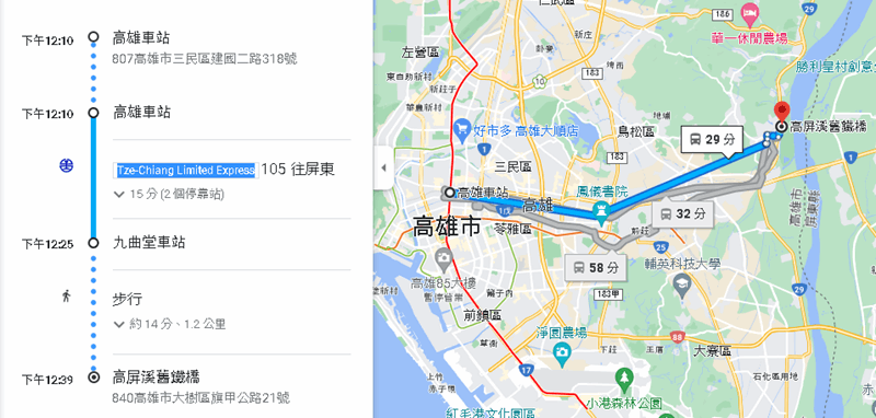 搭乘台鐵火車:到高雄車站下車 → 轉搭往九曲堂車站列車(區間車或自強號)至九曲堂車站下車 → 再步行約14分鐘即可抵達高屏溪舊鐵橋