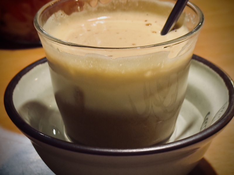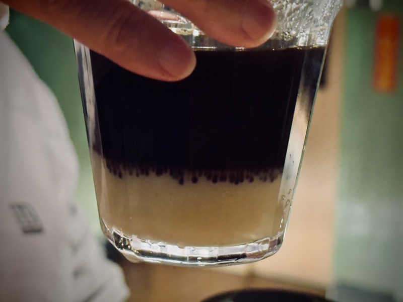 滴完後的咖啡看起來真的很有層次感,上層是深色的咖啡,帶著濃濃的苦味,而底層是白色的煉乳