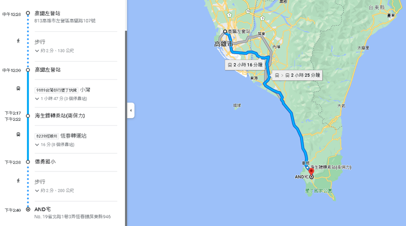 搭乘高鐵到高鐵左營站下車後轉搭 → (9189)台灣好行墾丁快線至小灣站下車 → 轉搭(8239)經潮州至僑勇國小站下車後步行約2分鐘抵達AND宅