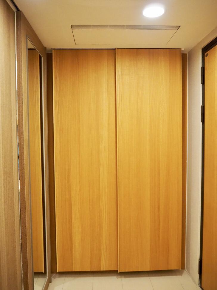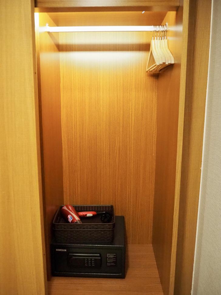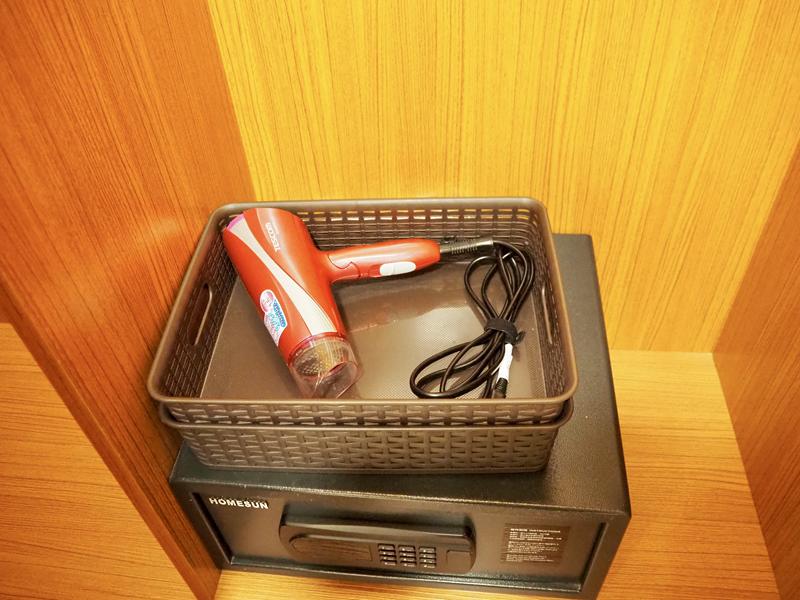 房內的衣櫃在玄關處,裡面有衣架、保險箱、吹風機