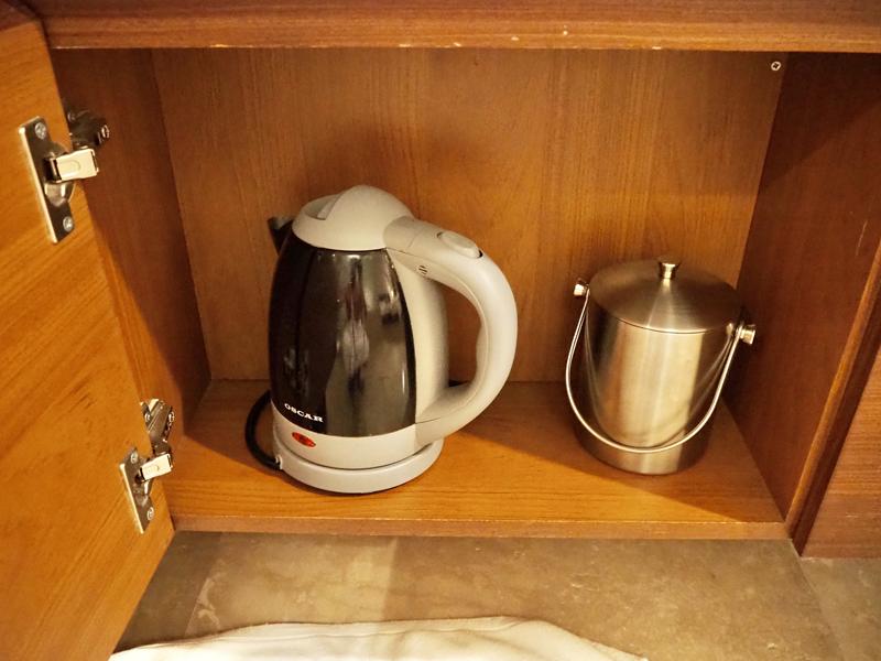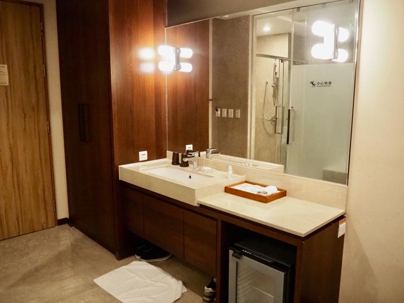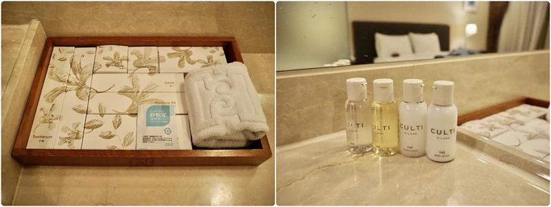 洗手台上有擺放著盥洗用品,底下有電冰箱、咖啡、茶包、馬克杯、熱水壺、冰桶,沐浴用品特別選用義大利Culti的品牌有淡淡的綠茶香氣很好聞