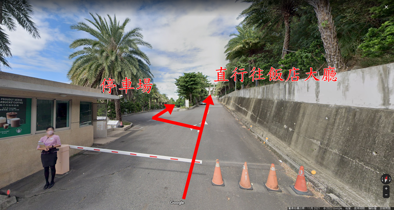 轉進來後在入口處會有服務人員接待,左邊是前往飯店停車場,直型是前往飯店大廳,停車場與飯店大廳有一段距離,建議先前往飯店大廳下好行李後再把車開到停車場