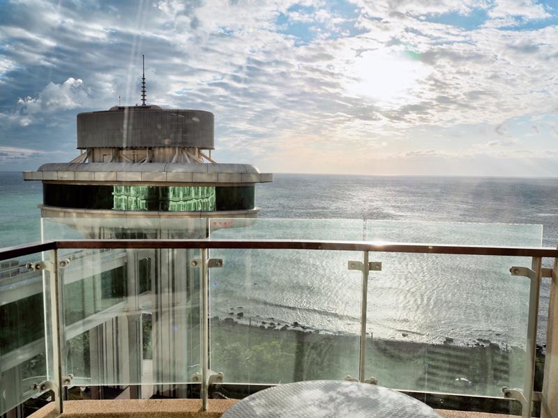 來到陽台看到眼前這一片令人讚嘆的景色,這裡可以欣賞無邊際的甚藍海景,到了傍晚則是晚霞夕照,入夜之後還有墨夜星綴,各種不同的景色風情只需在房內的這一片陽台就可以輕鬆欣賞,跟一邊鄰房的陽台沒有遮蔽物,有時還可以跟隔壁的房客聊聊天,但對於想要私人空間的人可能就會不太習慣了