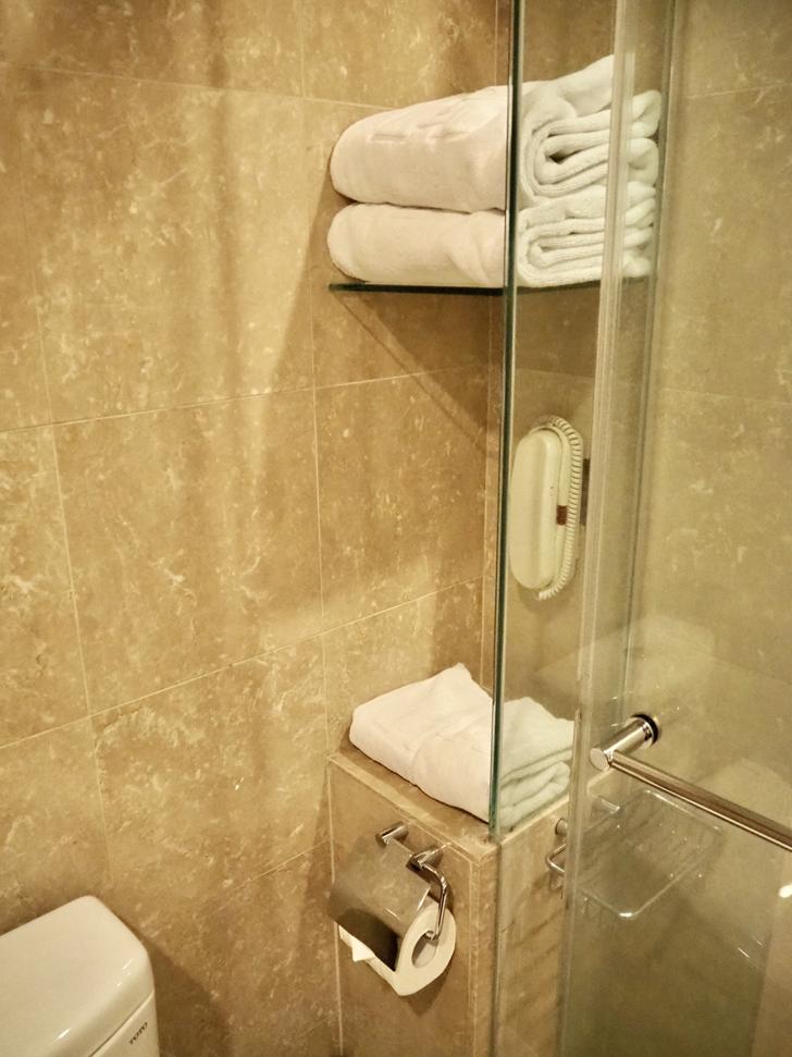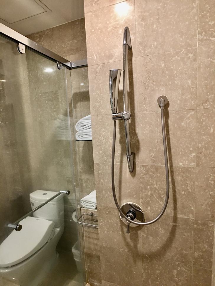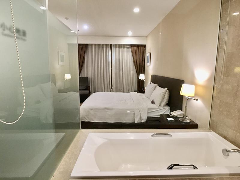 整面大理石設計的乾濕分離衛浴空間明亮舒適有:浴缸、免治馬桶、淋浴間,透明玻璃的設計跟房內可以直接看到房內空間,雖然這樣可以邊泡澡邊看電視,但不是情侶入住的話會比較尷尬,但有設計拉簾,拉下來的話就完全是隱蔽的空間了