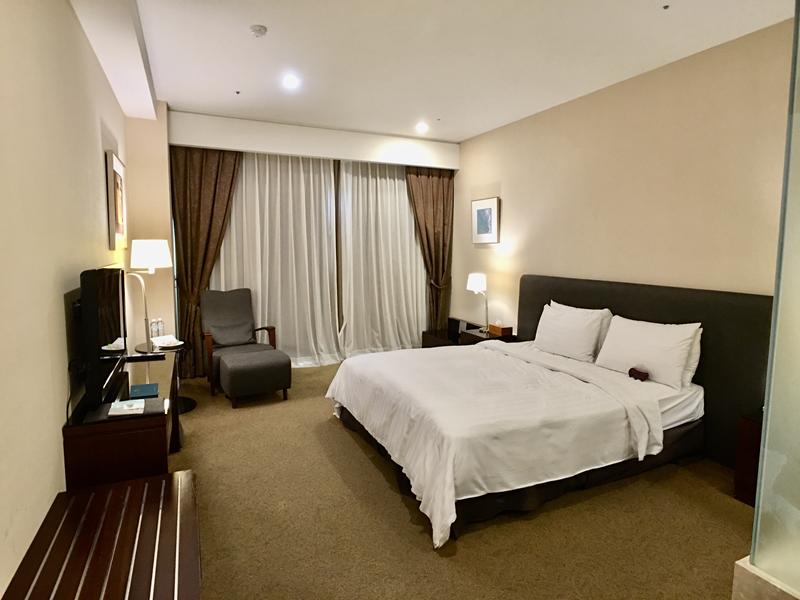 打開房間印入眼簾的是12坪大的客房,白色加上棕色系時尚又不失典雅,電視櫃、洗手台、雙人床(210cm x 180cm)、小沙發、乾濕分離的浴室,整潔舒適,一進來就超級滿意這個客房