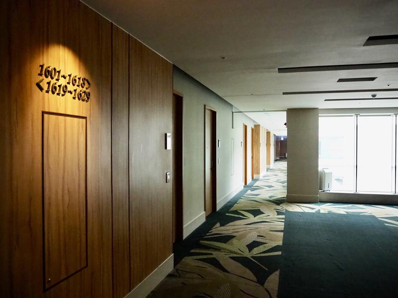 一出電梯就可以看到正前方牆上有房號指引,很容易就可以找到自己的房間,H會館也開業近10年了,但保持的還很新穎,光是房間走道就讓人感到舒適,一旁運用透明玻璃採光良好,靠山這一面沒有客房,所以不管是入住哪間房型全都是面海