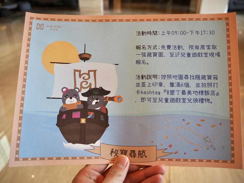 除了上述的那些遊戲以外,在遊戲室還可以報名飯店準備的每日活動密寶尋航(每房限定一次),報名後服務人員會給你一張藏寶圖,在飯店內的各個區域(客房區除外)有藏著寶箱,找到寶箱後裡面有印章,集滿六個後拍照打卡上傳並標點(#墾丁最美地標飯店)就可以兌換一個小禮物