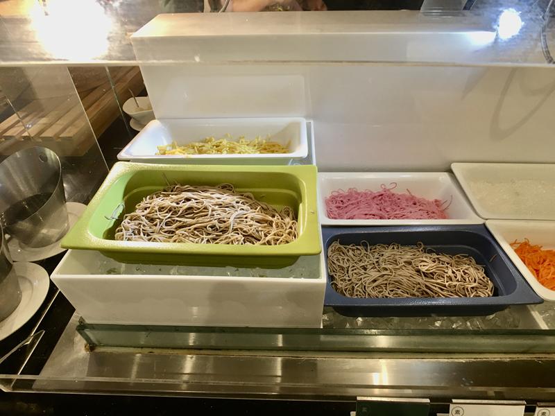 蕎麥涼麵以及涼麵調味料:香菇絲、蛋絲、蘿蔔絲、小黃瓜等