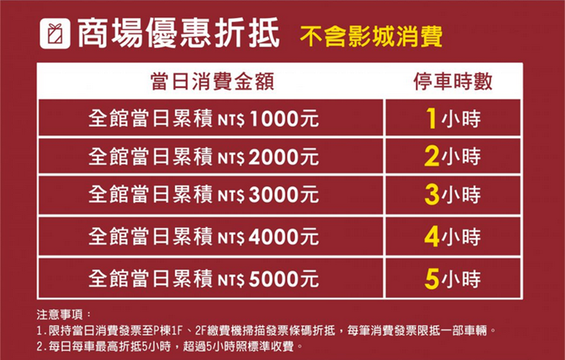 2.當日消費累積每台車最多可折抵5小時(規則參考上圖)