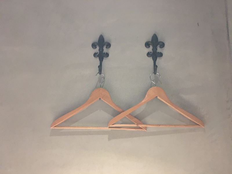 牆上有兩個衣架可以用來掉外套或襯衫