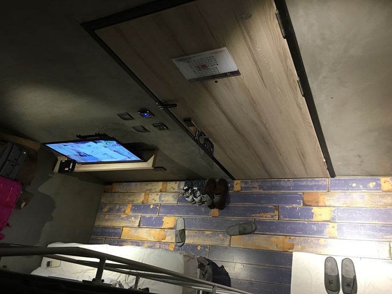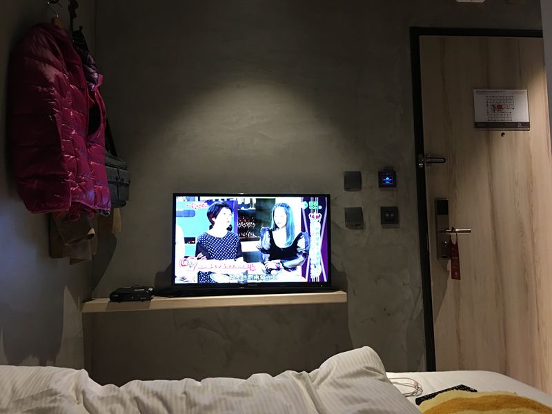 右邊就是電視跟床鋪,小小的房間裡燈光不多,有點昏暗