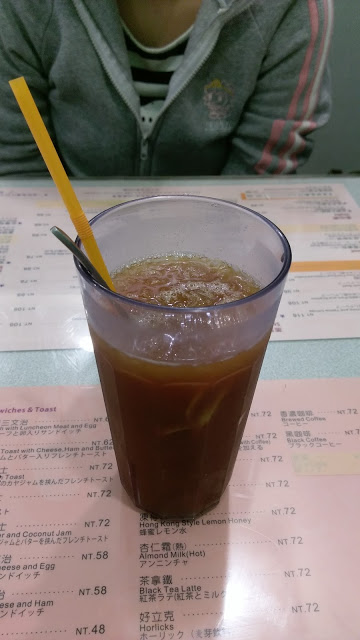 【凍檸茶】 他的凍檸茶喝起來是 淡淡的檸檬味+上微苦的茶味 跟一般印象中的凍寧茶酸酸甜甜的口味不一樣 不知道是不是真正的港式凍檸茶就是這樣的口味 沒去過香港喝過道地香港的凍寧茶也不知道 不過整體來說算好喝 (有去香港喝過的人歡迎留言跟我說 0.0″)