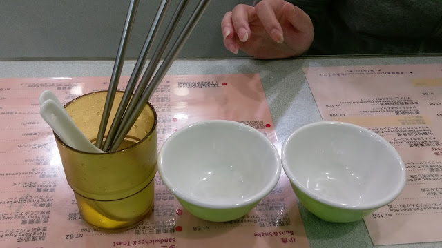 入座之後服務人員會送來餐具 那個杯子裡的水可不是用來喝的,那個是洗餐具用的 (據說香港茶餐廳文化都是這樣放餐具的)